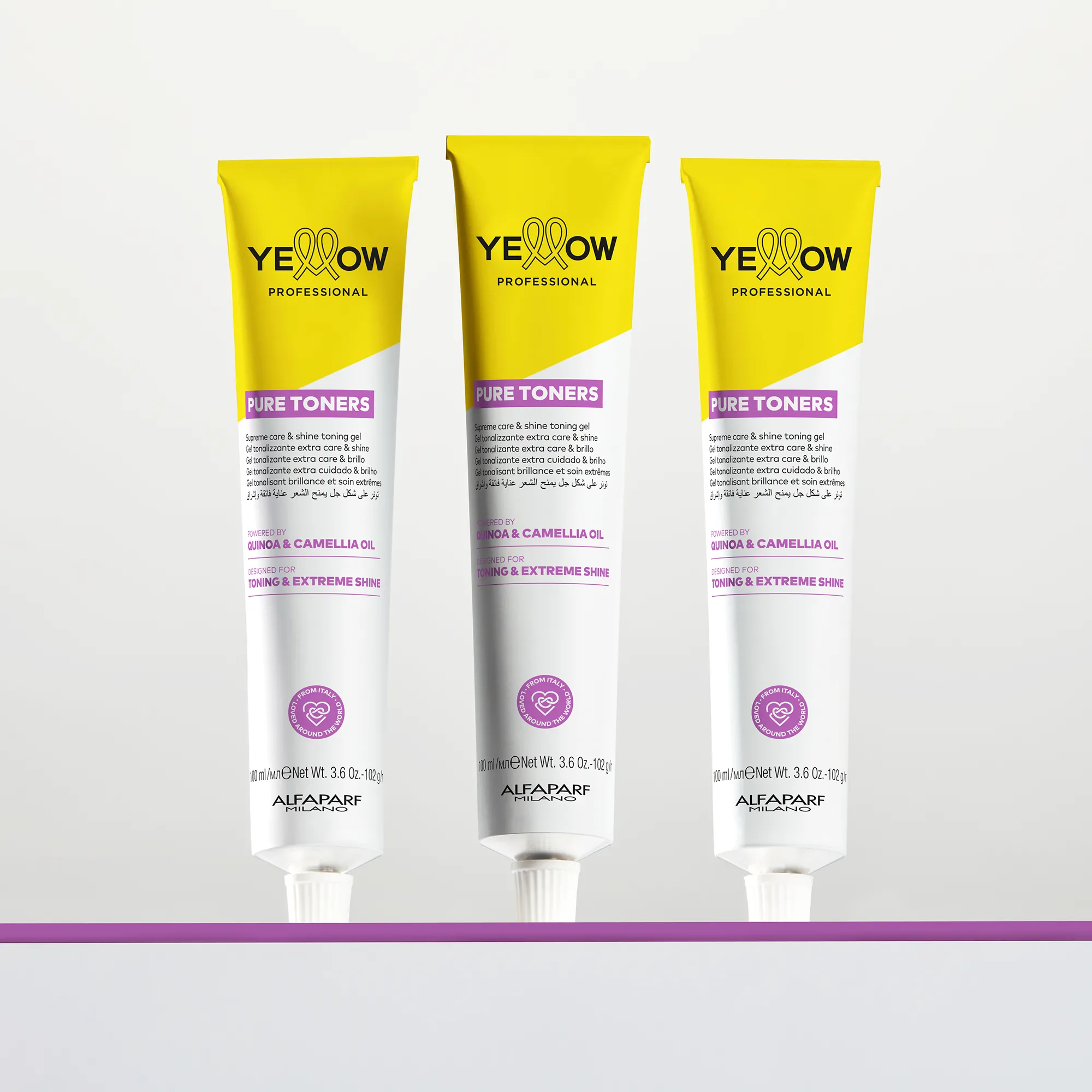 Yellow Professional Pure Toners are an ammonia-free demi-permanent colour with an extra care effect, suitable both for toning bleached hair and for maintaining a colour between highlights services. For ultra- shiny colours with a “wow effect” that last.